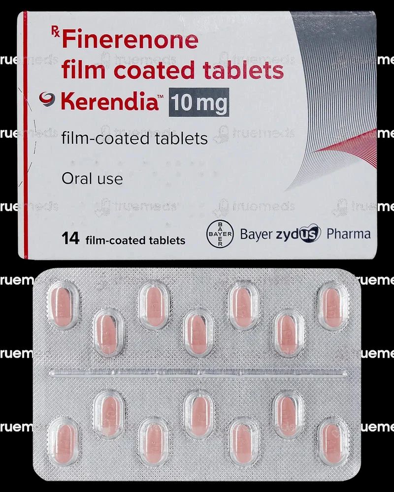 Kerendia 10 Tablet is medicine used in the treatment of chronic kidney disease (CKD) caused by type 2 diabetes (T2D). It works by blocking a certain hormone in the body, which can help prevent the kidneys from getting worse and reduce the risk of heart-related issues like heart attacks and heart failure.