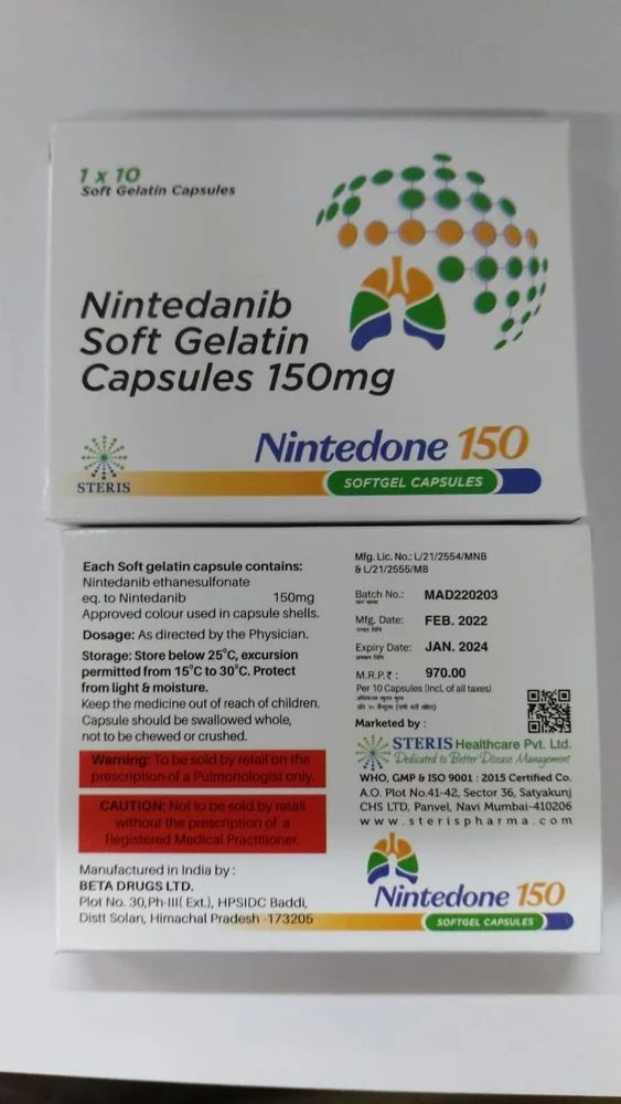 intena 150mg Soft Gelatin Capsule is used in the treatment of idiopathic pulmonary fibrosis and non-small cell lung cancer. It works by targeting certain pathways involved in the growth and progression of these diseases and helps to stop or slow the spread of cancer cells.