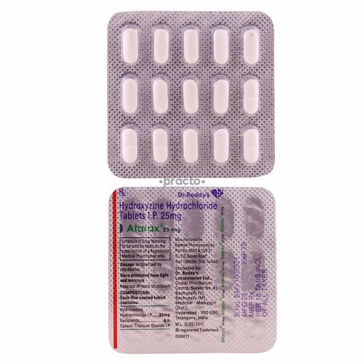 Atarax 25mg Tablet is used to treat anxiety and helps to get relaxed before or after surgery. It is also used to treat symptoms of skin allergy like itching, swelling, and rashes in conditions such as eczema, dermatitis, and psoriasis.
