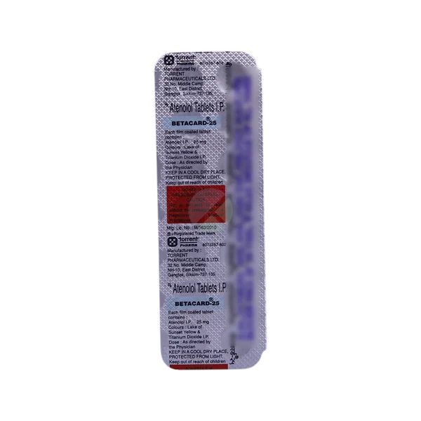 Betacard 25 Tablet belongs to a group of medicines called beta-blockers. It is used to treat high blood pressure (hypertension), angina (heart-related chest pain), irregular heart rhythms (arrhythmia). It also helps to prevent future heart attacks and stroke.