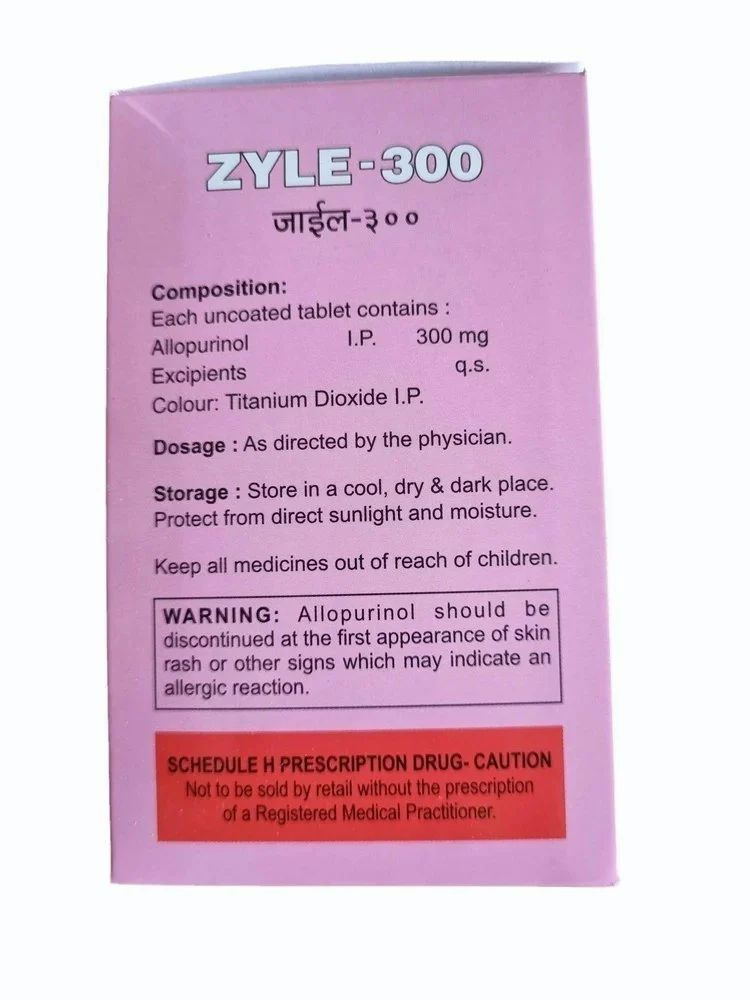 Product introductionZyle 300 Tablet is a medicine used to treat and prevent gout. Gout happens when there is too much uric acid in your body and it forms into crystals that can appear around your joints and kidneys and cause pain. This medicine helps to keep uric acid levels low.