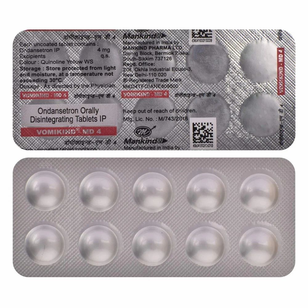 Vomikind -MD 4 Tablet is an antiemetic medicine commonly used to control nausea and vomiting due to certain medical conditions like stomach upset. It is also used to prevent nausea and vomiting caused due to any surgery, cancer drug therapy, or radiotherapy.