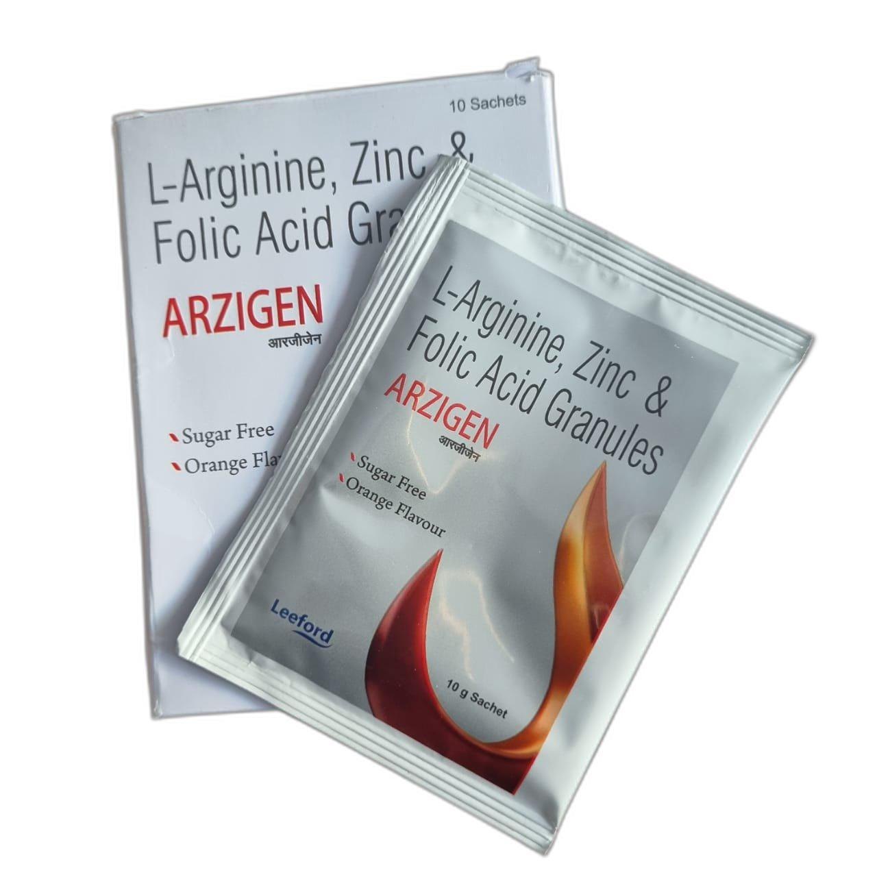 Arzigen Sachet (10gm Each) is an oral powder that contains a combination of ingredients, including Folic acid (2.5mg), L-arginine (3g), and Zinc (10mg). It works as a nutritional supplement that may provide support for various aspects of health, such as cardiovascular health, immune support, and red blood cell formation. It is suggested to be safe to take throughout pregnancy.