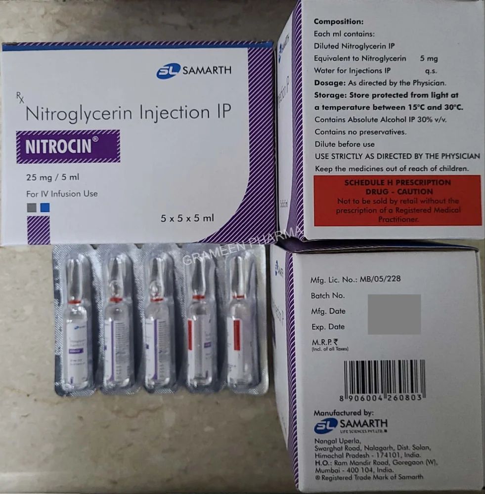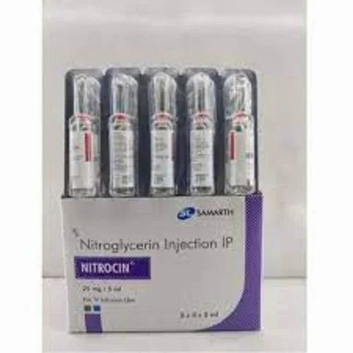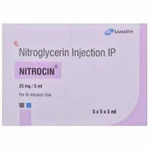 Nitrocin 25mg Injection is used to treat and prevent heart-related chest pain (angina). Angina occurs when the heart muscle is not getting enough blood. This medicine works by relaxing and widening blood vessels so blood can flow more easily to the heart. It has a very short-lived effect.