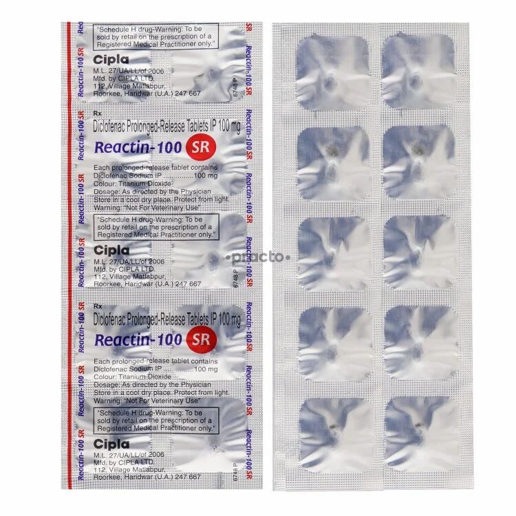 REACTIN SR 100MG TABLET contains Diclofenac, which belongs to the group of medicines called Nonsteroidal Anti-Inflammatory Drugs (NSAIDs). It is used to manage pain and inflammation related to sprains, strains, and other injuries post-surgery, gout (excessive uric acid accumulation in joints), backache, rheumatoid arthritis (immune system attack on healthy cells by mistake, causing inflammation), osteoarthritis (flexible tissue at the ends of bones wears down), ankylosing spondylitis (spine inflammation), and pyrophosphate arthropathy (crystals of a calcium salt causing joint problems).