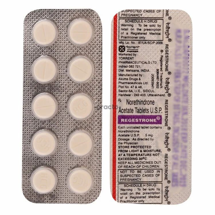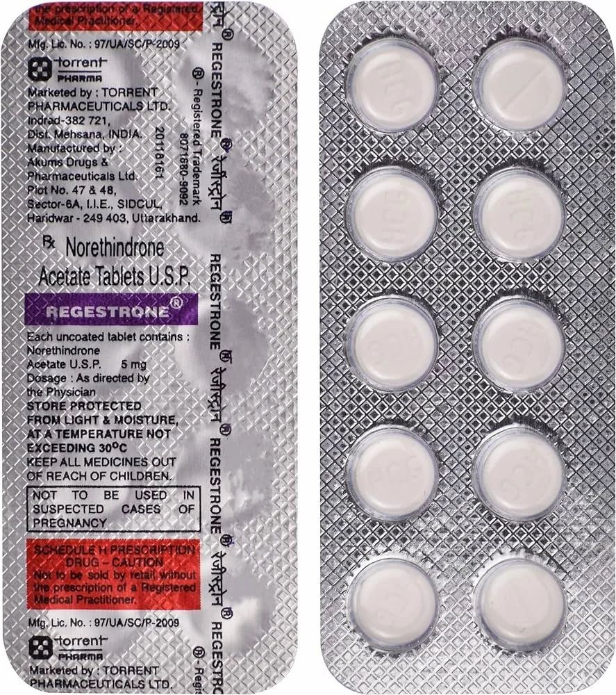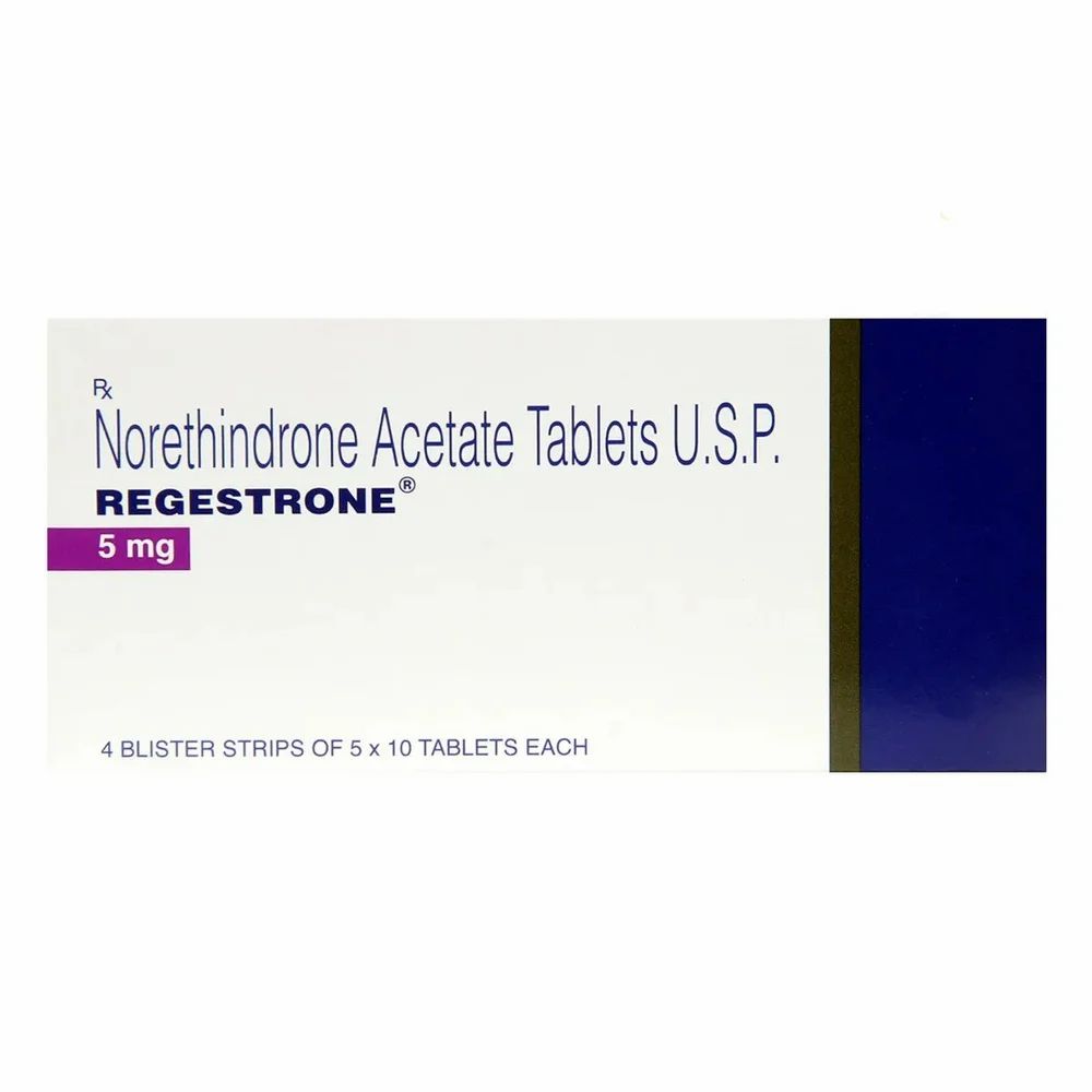 Regestrone 5mg Tablet is a synthetic hormone medication containing **norethisterone**, a progestogen. It is commonly used to treat various menstrual disorders, such as irregular periods, heavy menstrual bleeding, and to delay periods. Norethisterone mimics the effects of the natural hormone progesterone in the body, helping to regulate the menstrual cycle and address conditions related to hormone imbalance.