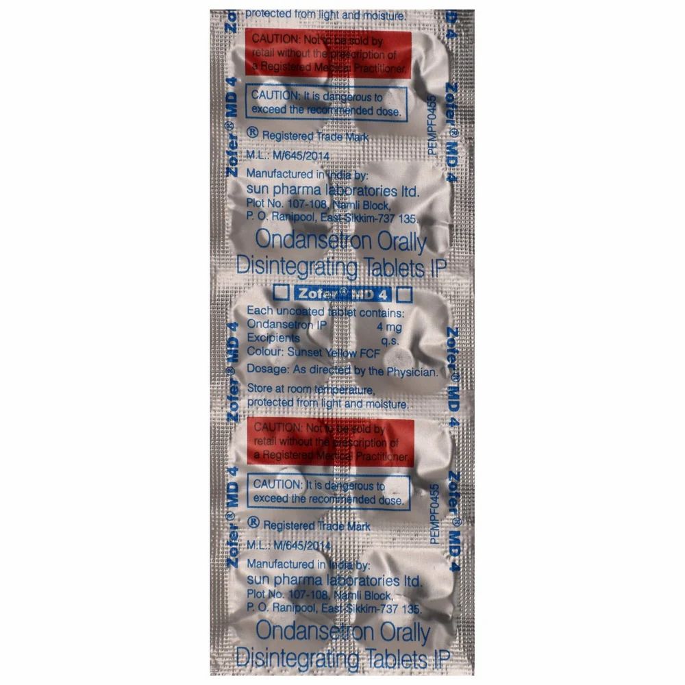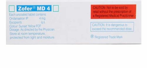 Zofer MD 4 Tablet is an antiemetic medicine commonly used to control nausea and vomiting due to certain medical conditions like stomach upset. It is also used to prevent nausea and vomiting caused due to any surgery, cancer drug therapy or radiotherapy.Request